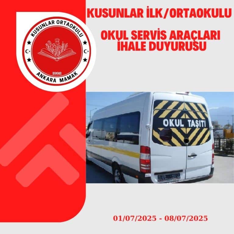 2025-2026/2026-2027 Eğitim Öğretim yıllarında geçerli olmak üzere 2(İki) Eğitim-Öğretim yılı İçin Kusunlar İlk / Ortaokulu Taşımacıyı Tespit Komisyonu olarak, Okul Servis Araçları Hizmet Yönetmeliğinin 5. maddesi 3. fıkrası ve 7. maddesi uyarınca ´Okul Servis Taşıması İşi´ ihalesi 09/07/2025 tarihinde Saat: 10:00´da Kusunlar İlk / Ortaokulu Konferans salonunda yapılacaktır. İhaleye katılma şartnamesi ve istenen belgeler aşağıda belirtilmiştir. Şartname dosyası Kusunlar İlk / Ortaokulu Müdürlüğü´nden ücretsiz teslim alınabilecektir. Uygun koşulları taşıyan ve istenen belgeleri hazırlayan iştirakçiler Açık Teklif İletme Usulü ile tekliflerini okul ''Taşımacıyı Tespit Komisyonuna'' 08/07/2025 Salı günü Saat 17.00 ´a kadar imza karşılığı teslim etmeleri gerekmektedir.